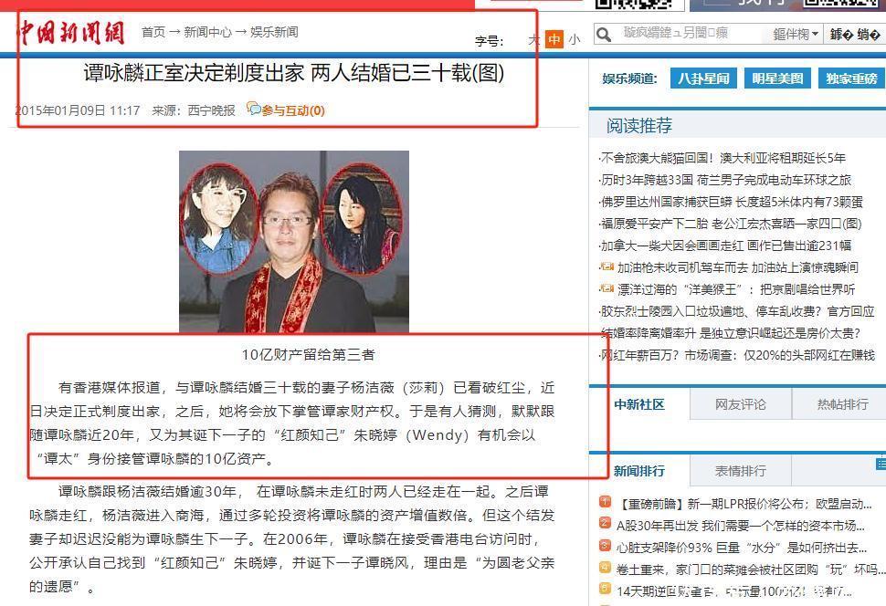 直到2006年谭咏麟父亲去世,谭咏麟才将朱咏婷与儿子谭晓风的名字与妻子杨洁薇一同登在讣告上, 也算正式公开了这段一夫二妻的不正当关系。
